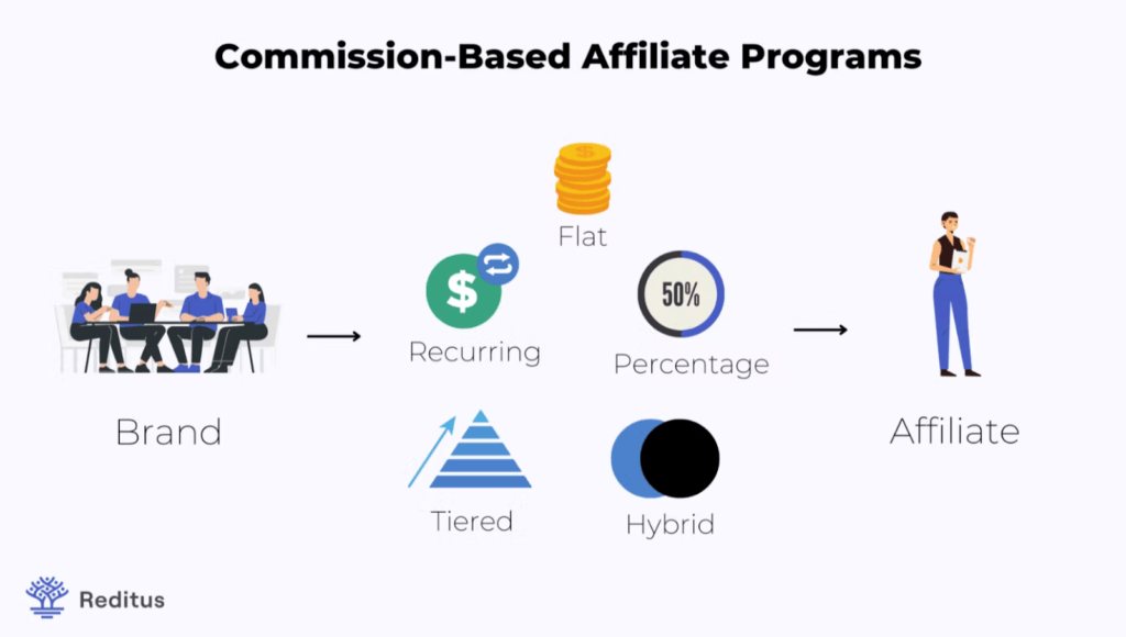 - Hybrid model: A combination of different commission structures or payment models can be used to address the specific needs of your business and your affiliates. For example, you might offer a flat-rate commission for each sale and a percentage-based bonus for hitting predefined performance targets.