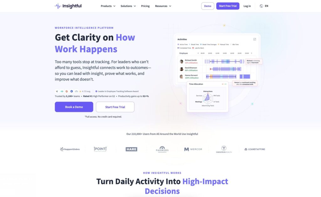 - Activity & Time Tracking: Insightful captures employee computer usage (apps, websites, idle time) and automatically maps work hours to projects.