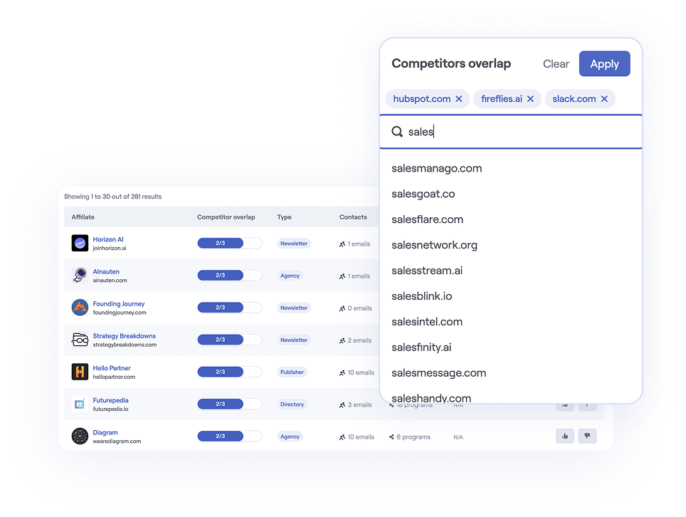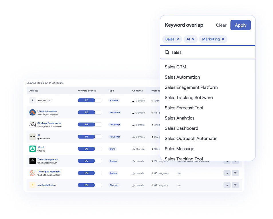 Automatically discover high-quality affiliates based on keywords, competitors, and ICP fit. Start growing growing your affiliate revenue without manual discovery.