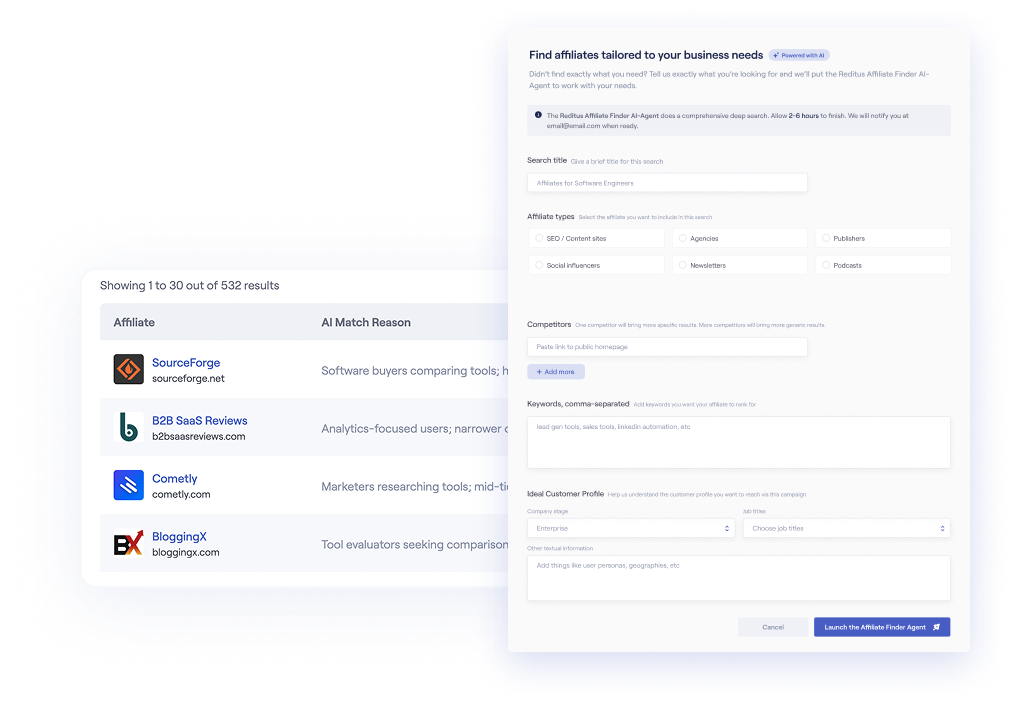 Most SaaS companies begin discovering relevant affiliates within minutes of setting up their account in Reditus. Fill our the form to have our AI recruitment engine scan keywords, competitor mentions, content intent, and other audience signals. Once you started the AI agent you will receive a list of high-fit affiliates without spending hours doing manual research.