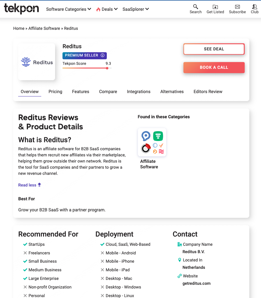 On Tekpon, you will find around ±50 software tools that fit the affiliate marketing category. This means there is some good competition within the industry. See below some of the reasons why Reditus has been awarded the badge.